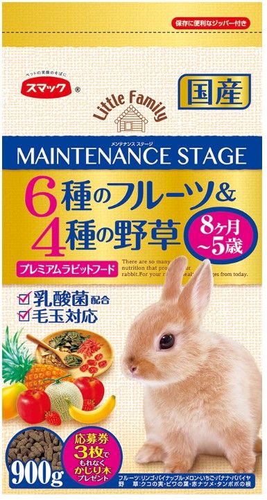 ウサギの嗜好性と健康を考え、6種のフルーツと4種の野草を配合しました