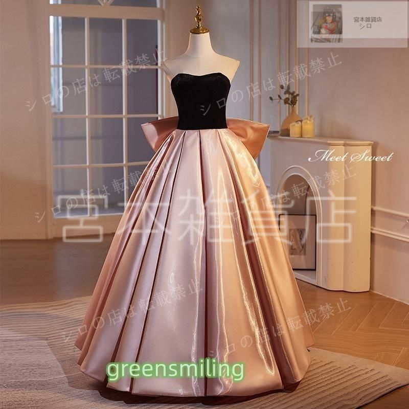 ドレス プリンセスライン ピンク ベアトップ 大きいリボン ロングドレス ウェディングドレス 結婚式 二次会 花嫁 前撮り 演 今週