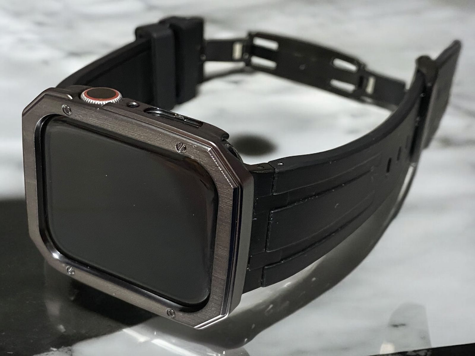 ゴージャスなデザインのApple Watch用ベルトです。金属部分には高品質な316Lステンレススチールを使用し、バンドと一体化した最新のデザインです。防水性能を備え、ボリューム感や迫力のある仕上がりになっています。バックルは強化型にカスタムされています。
