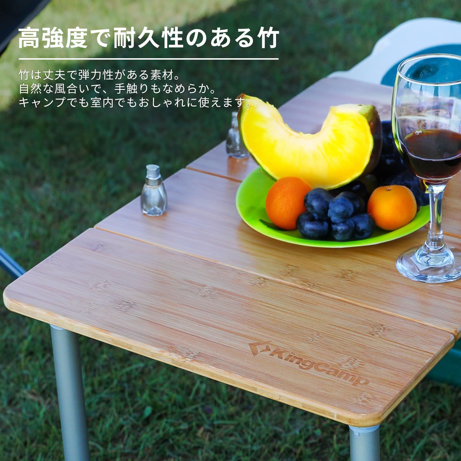 【頑丈な構造と耐荷重】KingCamp竹面テーブルは(重量:約3.1kg、耐荷重:30kg)頑丈で安定したフレーム構造で、風の影響を受けにくく、グラつきません。耐荷重性能も高く、食器や飲み物、必要なアイテムを安全に置くことができます。
