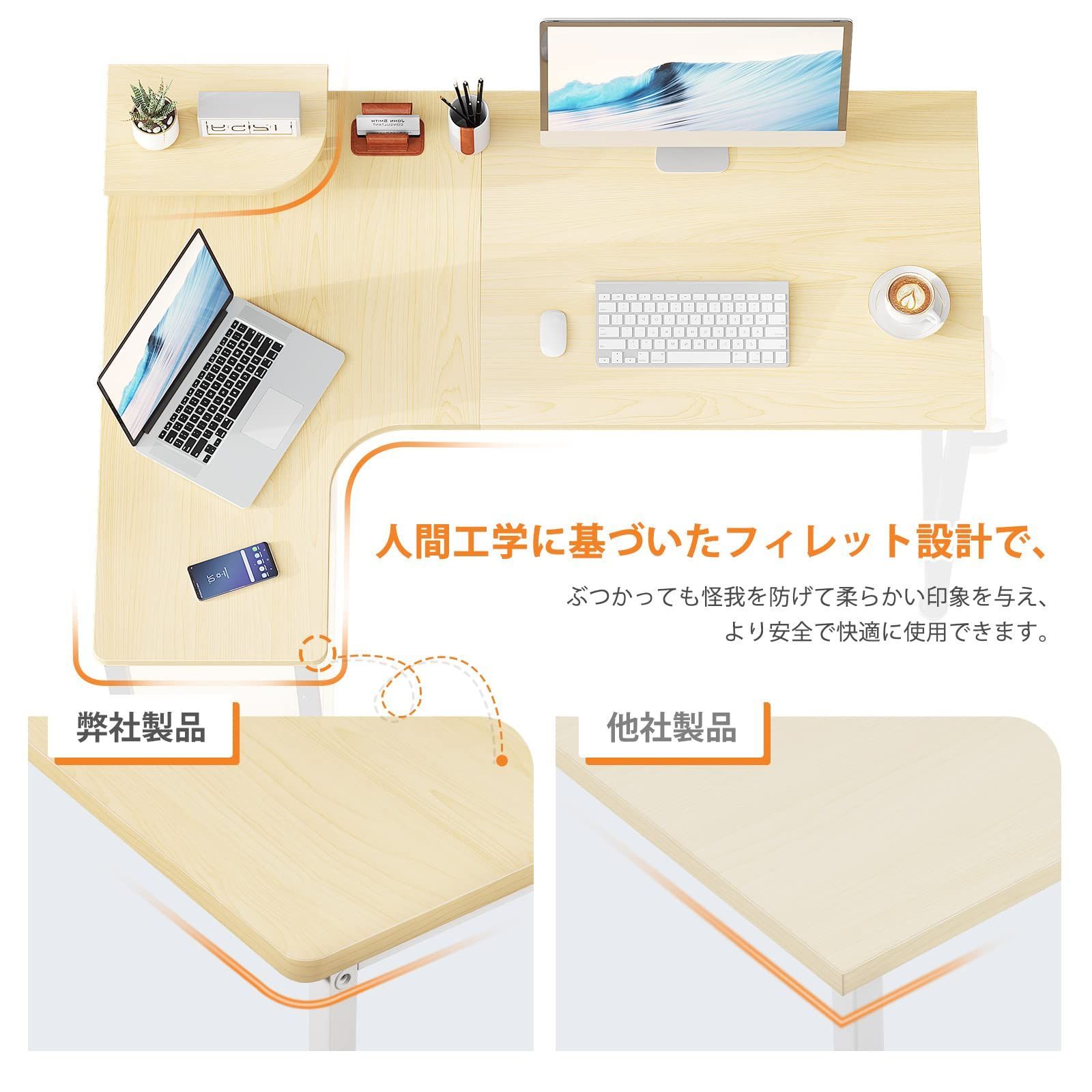 【組立簡単&耐久性高い】分かりやすい説明書あり、女性にも組立簡単です。汚れに強く、高強度のメラミン化粧板を採用し、キズや熱・水分に強く、長持ちしやすいコーナーデスクです。机の天板はフィレット設計で、安全性が高く、衝撃時に怪我を防げます。