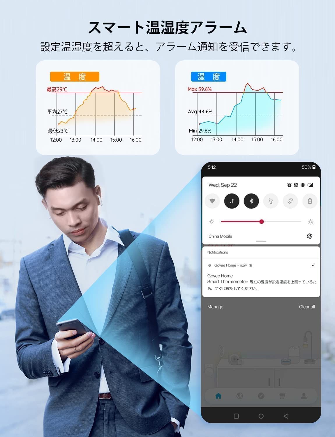 【異常アラーム通知】Govee 温湿度計は設定した温湿度範囲を超えると、アプリ通知が受信します。異常温湿度があれば、速やかに対応できるので、赤ちゃんがいる家庭やペットの世話に役に立ちます。