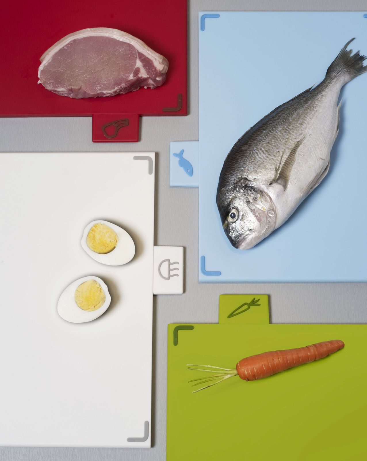 人気シリーズに滑り止めのラバーがついて新登場 ・肉/魚/調理済み食材/野菜と4枚のまな板を使い分け、菌の繁殖予防に効果的