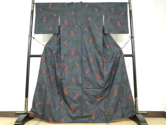 平和屋着物 本場大島紬 古代染色純泥染 7マルキ 石畳草花文 証紙付き 正絹 ud
