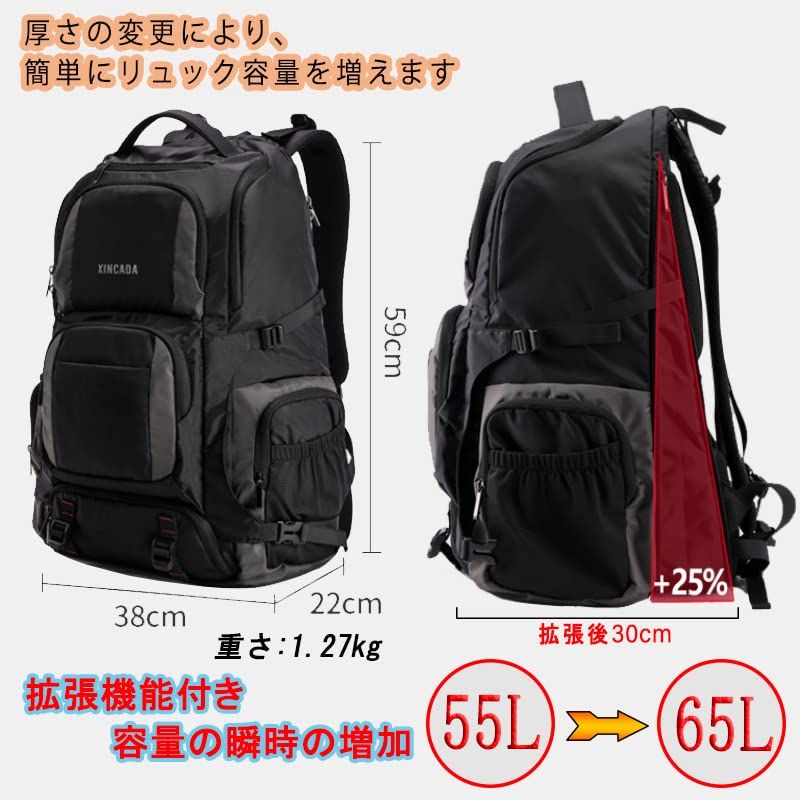 【収納力抜群】サイズ:約縦59cm × 横38cm × マチ22cm(拡張時30cm)、収納可能サイズ: 55-65L、重さ:1.27Kg。16個のポケットで使いやすさ抜群:最大17インチPC、Pad、A4サイズの書類や着替え、サングラス、帽子など必要なアイテムを、まとめて収納。キャンプや登山道具、旅行なら3~5泊分の荷物が余裕で入り、タウンユースだけでなく、非常時持ち出し用の防災リュックとしても十分ご活用いただけます。