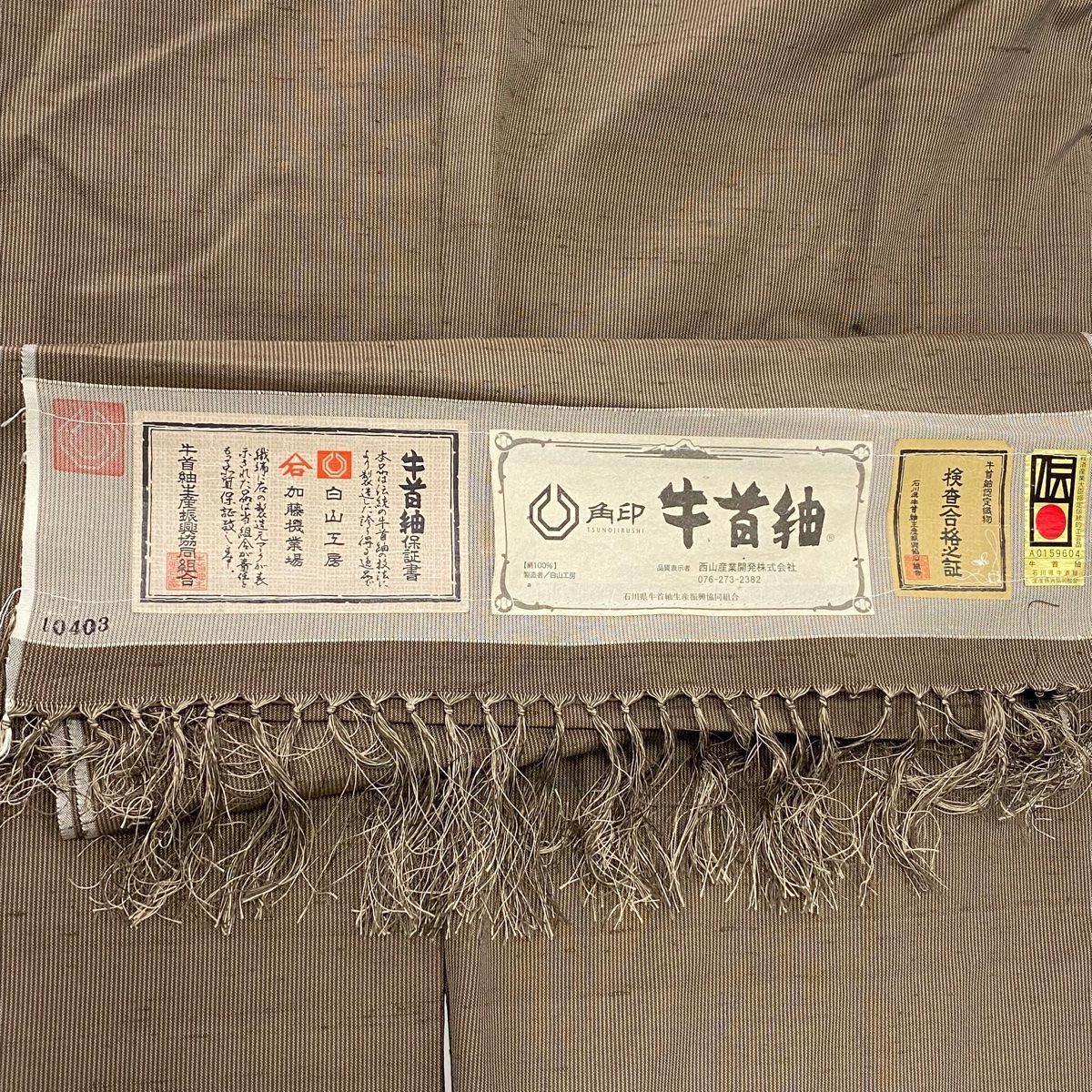 男着物 身丈143 cm 裄丈73.5 M 袷 牛首紬 落款 証紙 縦縞模様 焦茶色 正絹