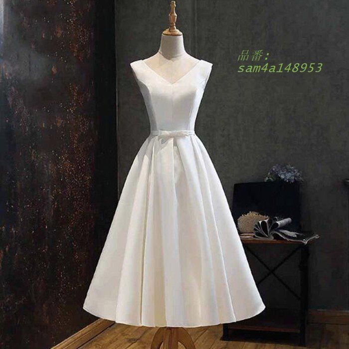 ミニ丈 ミモレ丈 ウェディグドレス 二次会 花嫁 パーティドレス 白 発表会 お呼びばれ 小さいサイズ おしゃれ ドレス 演奏会 結婚式 ワンピース am 4 a 148953