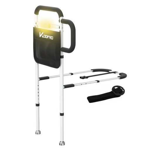 KOOPROベッドガードサポ-ト脚人感センサーライト付きダブル手すり長さ高さ調節 転落防止柵立ち上がり補助器具ストラップ小物整理バッグ付き安定性丈夫大人高齢者介護用組立簡単日