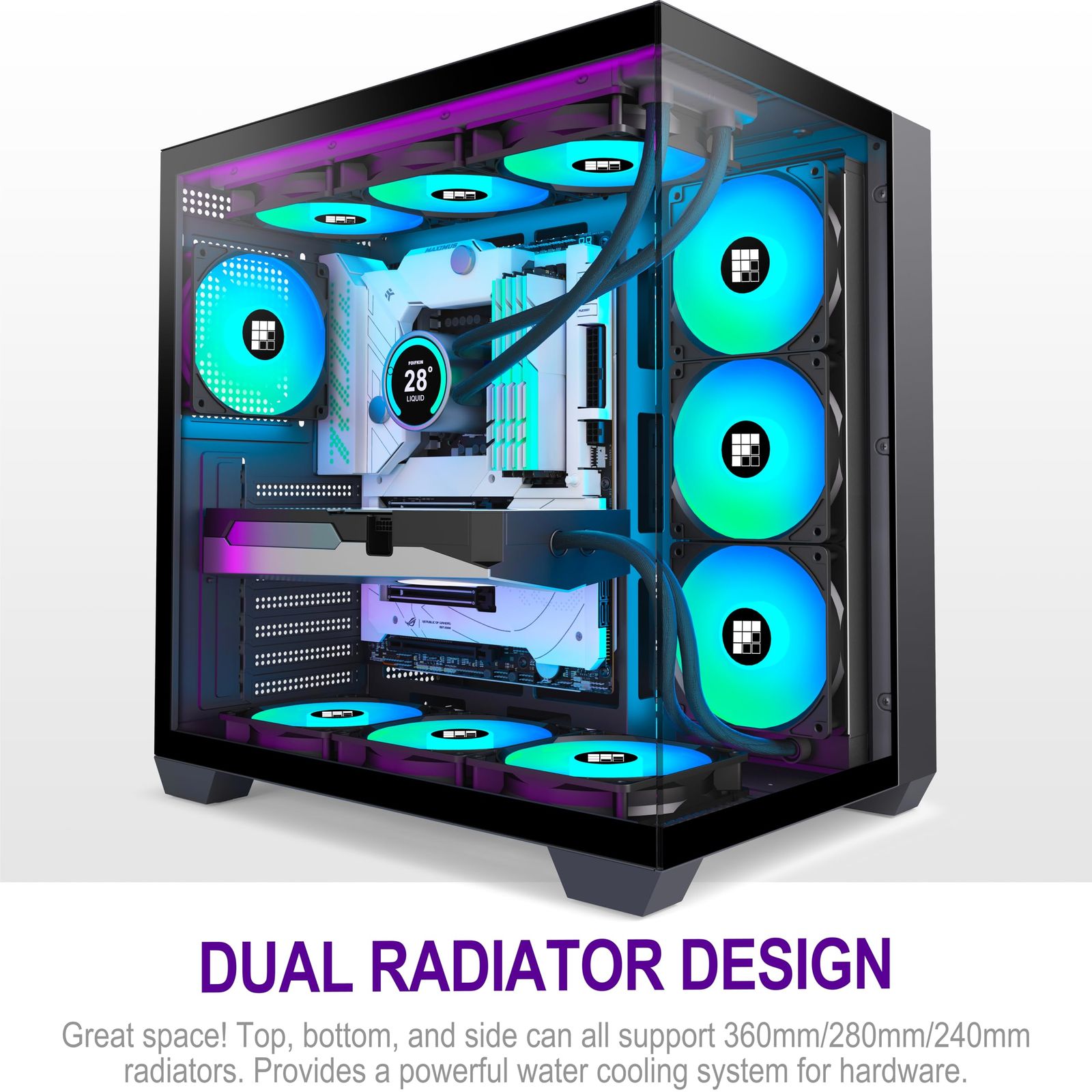 【270°パノラマデュアルキャビンデザイン】FOIFKIN F600 PCケースは、なめらかでモダンなデザインを採用し、270°のパノラマ強化ガラスパネルで構成された広い視野を実現します。完全に透明なガラスカーテンウォールのデザインは、ハイエンドのハードウェアコンポーネントに高品質のディスプレイプラットフォームを提供します。強化ガラスは遮音性に優れており、オフィス/ゲーム環境での快適性が高く、工具を必要とせず、分解が簡単です。