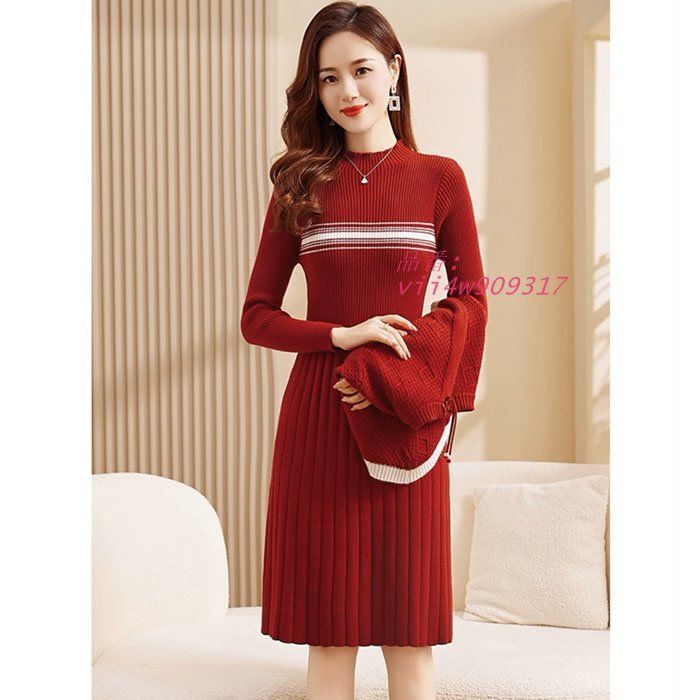 ケープ付き 膝丈長袖ニットワンピース 黒 赤 カーキ 茶 デート タイトニット ファッション 韓国 レディース カジュアル vii 4 w 909317