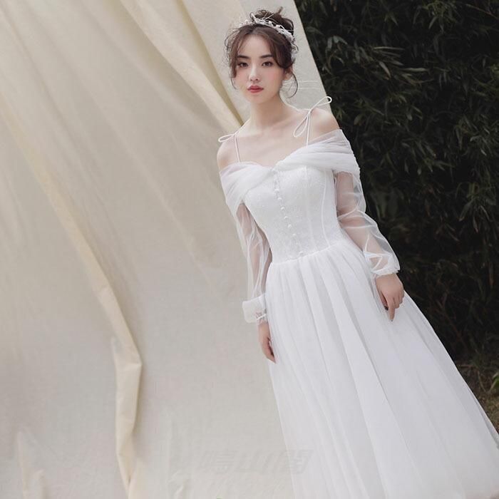 ウエディングドレス 結婚式 二次会 袖あり 花嫁 披露宴 ウェディングドレス ロングドレス ブライダル Aラインドレス wedding dress ホワイWP特別価格104