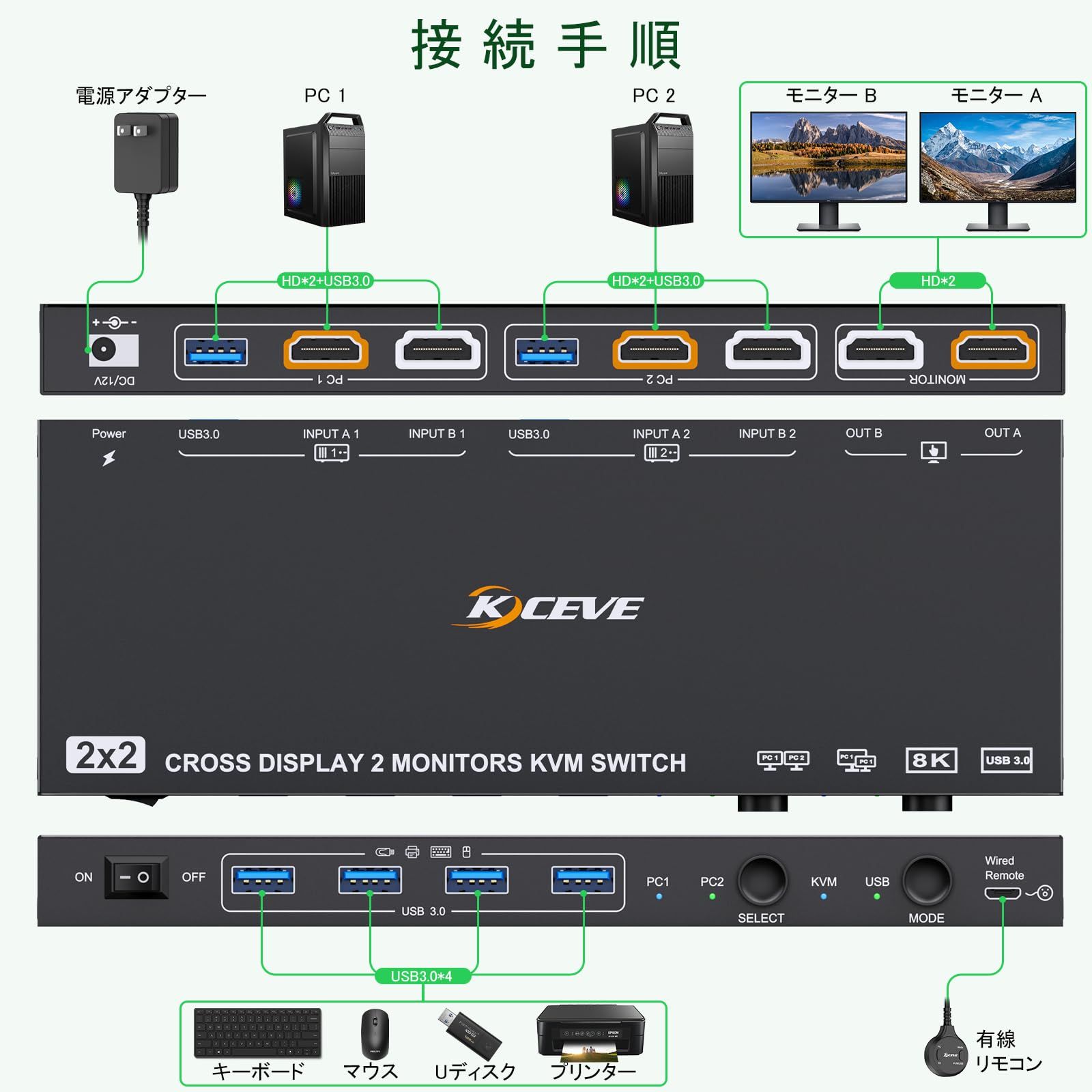 ANXQQ 8 K KVM スイッチ HDMI 2 台のモニターと 台のコンピューターを共有 新しいアップグレード モード USB モードをサポート 3.0 ポート付き スイッチャー 有線リモコンと電源アダプターが付属