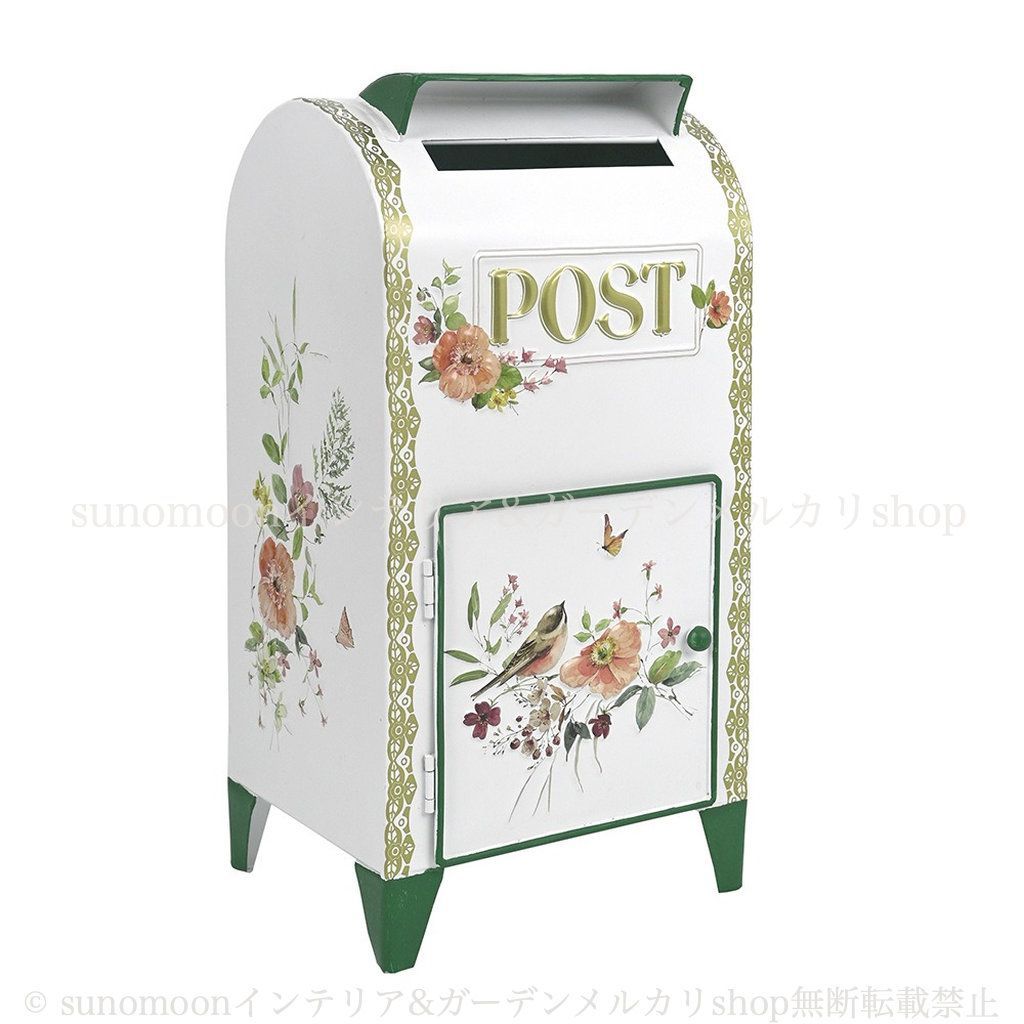 こちらの置き型ポストは、ヨーロッパスタイルのデザインが特徴的で、美しい鳥と花の絵柄が施されています。重厚感のある鉄素材で作られているため、耐久性が高く、長年にわたってご利用いただけます。特に、洗練された花の絵は、庭に彩りを添えるだけでなく、訪れる人々に優雅な印象を与えてくれることでしょう。