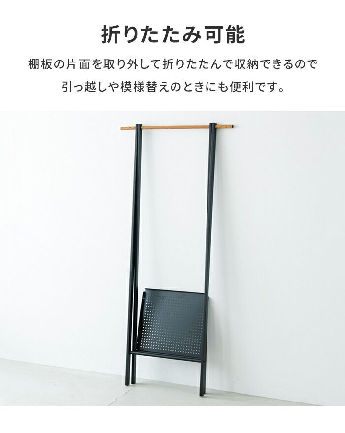 フレームは安定感のある三角設計に、落ち着きのあるマットな質感。木を思わせるハンガーバーとフックはスチールにリアルな木目柄を施しました。オープンタイプで開放的な空間に仕上げます。パンチング模様が施された収納棚にはお気に入りのバッグや靴を置いてディスプレイも可能。棚板の片面を取り外して折りたたんで収納できるので、引っ越しや模様替えの際にも便利。掛けて置いて無駄のない機能とスタイリッシュなデザインを兼ね備えたハンガーラックです。