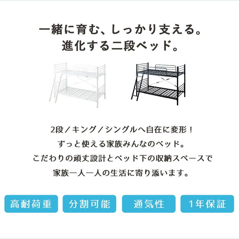 ・上下分割が可能で、二段ベッドだけでなく、キングベッドやシングルベッドとしても使用できます。