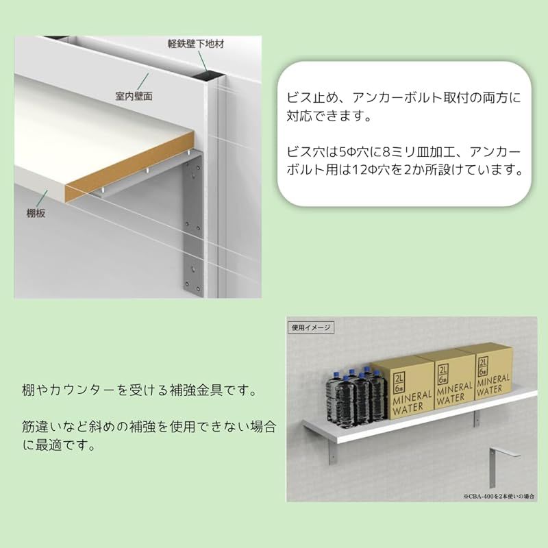・昭和45年(1970年)に創業した東大阪のオーダーメイドの金物製作工場で作った建築用補強金具です。 ・曲げ加工にて1つ1つ職人の手で作っているこだわった棚受け金具です。 ・建築内装工事でカウンター・棚などを軽鉄壁やコンクリート壁に固定するためのL型ブラケットです。 ・この金具は、肉厚のアングル形状なのでカウンター下面の仕上がりがシンプルに施工できます。 ・肉厚の6ミリと9ミリをご用意しました。アンカー用12Φ穴とビス止め用5φ穴で作業性抜群です。