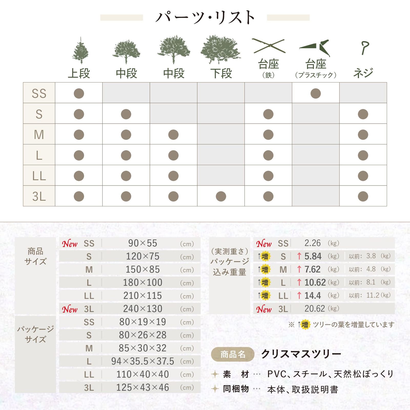 ・[組み立て簡単&4サイズ展開]簡単に組み立てられる設計のツリーは、不慣れな方でも手軽にセッティングが可能!また6サイズ(SS90cm・S120cm・M150cm・L180cm・LL210cm・LLL240cm)で展開されているため、設置場所や好みに応じて最適なサイズを選ぶことができます。