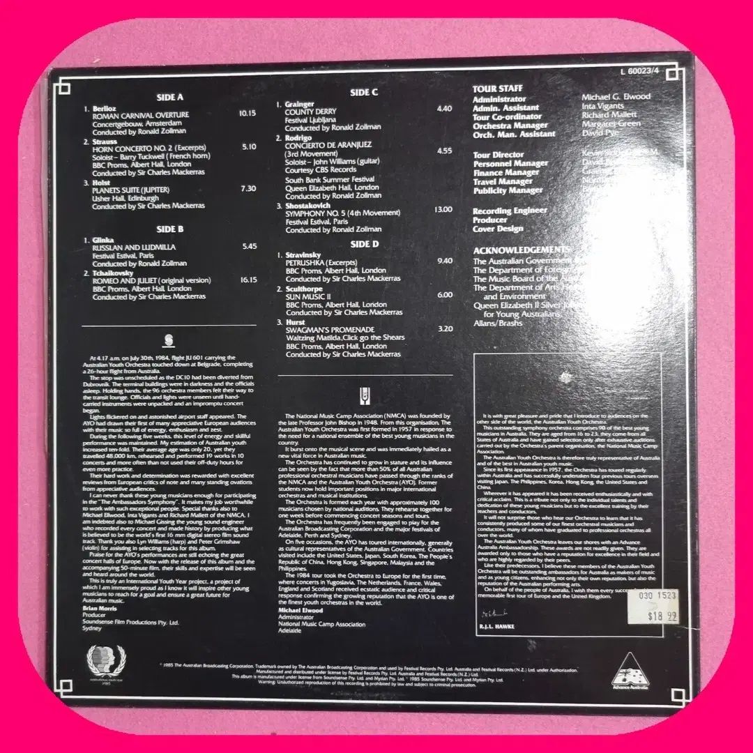 状態 NM/NM アンバサダーズ・シンフォニー・ヨーロピアン・ツアーLPです。オーストラリア・ユース・オーケストラによるヨーロッパツアーのライブ録音です。ジョン・ウィリアムズ、バリー・ダークウェルによる演奏もお楽しみいただけます。