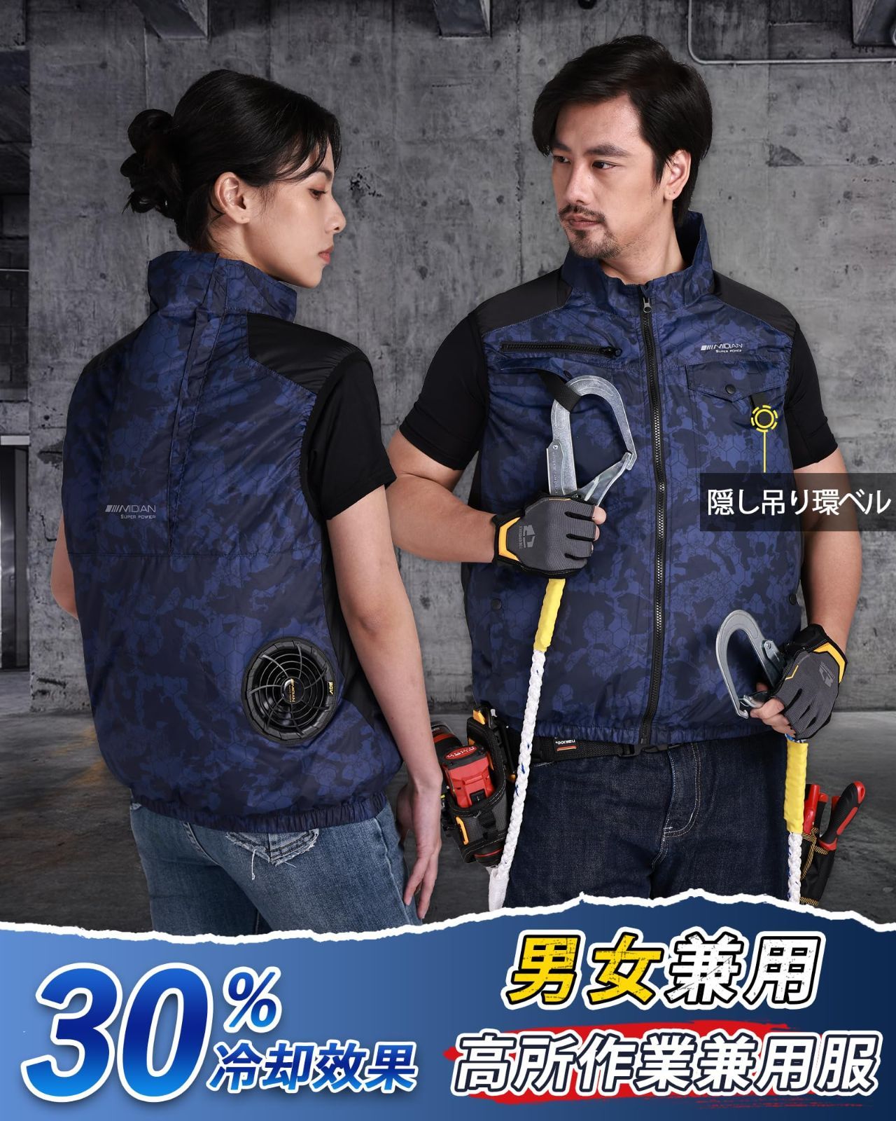 【2024年新登場・フルハーネス安全帯対応】2024年最新の空調作業服ベスト、今年の酷暑の中で初登場します。表地はポリエステル100%の素材で、優れた吸汗性、速乾性、耐摩耗性を備えています。内側にはチタン合金断熱コーティングが施されており、有害な紫外線から98%以上の保護を提供し、手元の扇風機付き作業服の性能を最大限に活用できます。空調服は高所作業をサポートし、胸ポケットの吊り紐と背面ポケットの開口部設計は全背負い安全ベルトと互換性があり、高温環境での作業をより安全で快適に行うことができます。MIDIANの製品はすべてPL保険に加入しており。