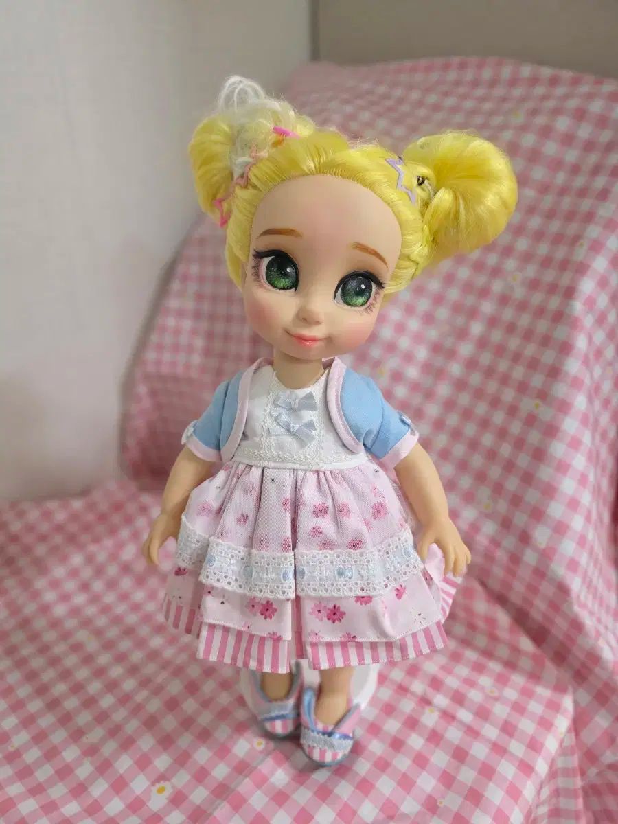 愛らしいレモンティンカーベルのベビ人形を販売しています。かわいいピンクの三段フリルワンピースと靴も含めて全てあげます。黄色い二股ヘアスタイルです!