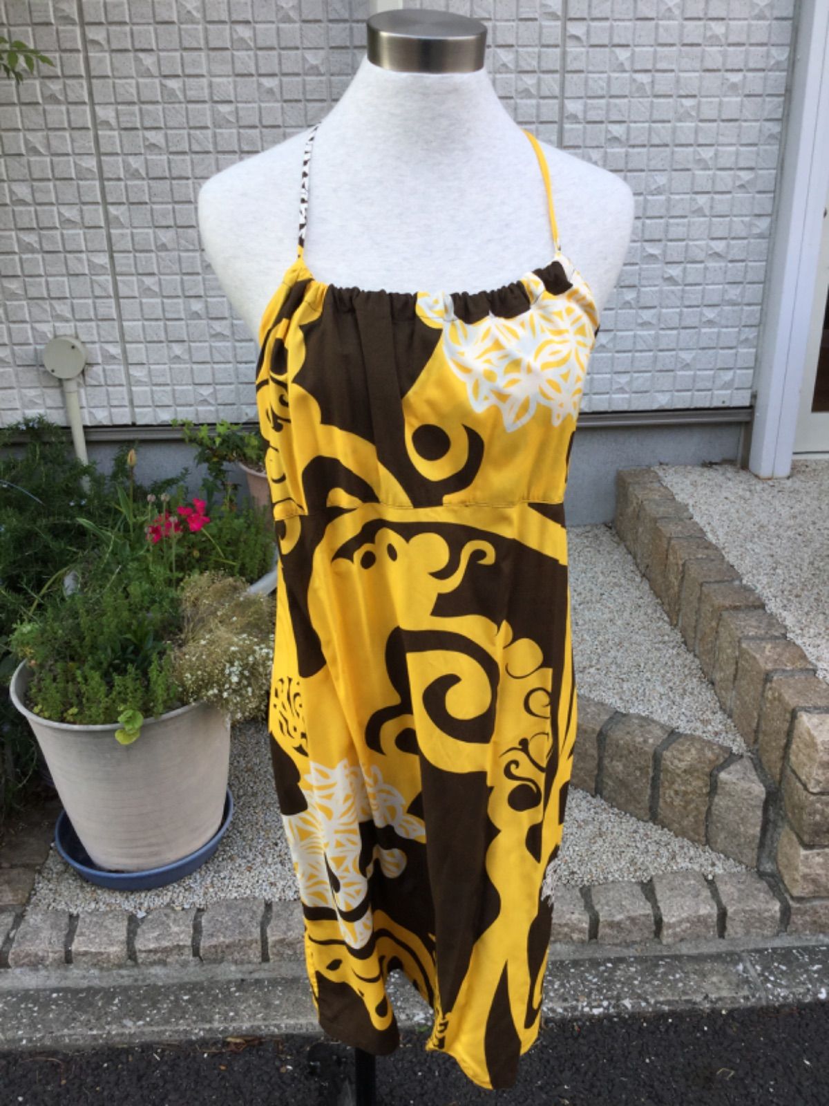 Manuheali i マヌヘアリィ後ろファスナーショートドレスMサイズYELxBRWxWHT