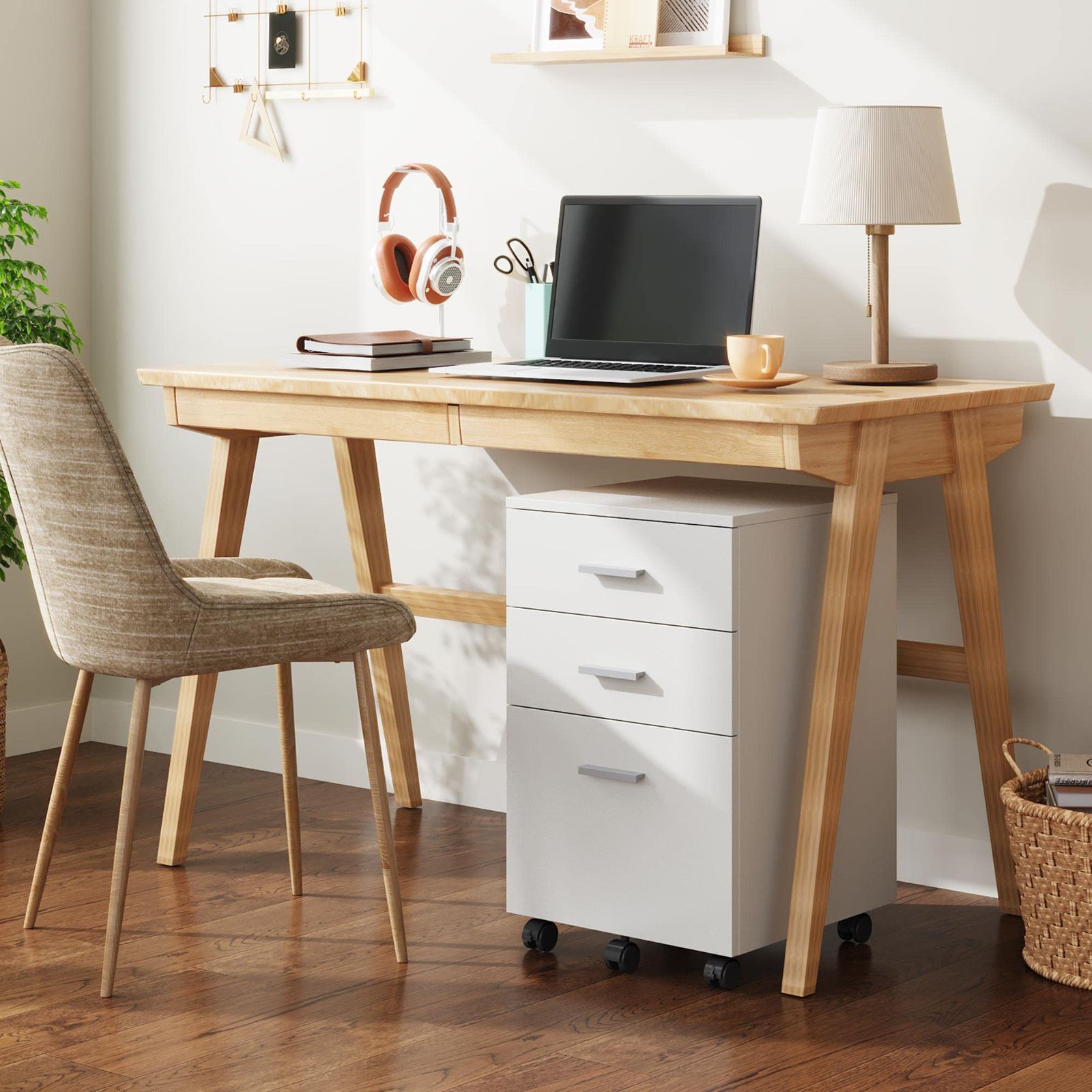 袖机 木製 オフィスワゴン 3段 キャビネット A 4対応 大容量 サイドワゴン キャスター付き デスクワゴン 幅400 奥行400 高さ595 mm ホワイト White