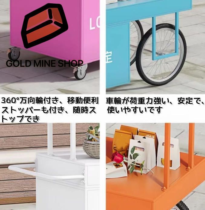 屋根や車体にはDIY等をでき、LOGO印刷等もできます。屋根部分にはお店の名前、食品のイラストボードを貼り付けたり、メニュー表も上から展示することで、後ろの方まで見やすくなります。タイヤ付きなので、重さのある物を置いても、移動も便利です。ストッパーも付きますので、ロックをすると、ぶつかったり、寄りかかったりした時も動き出しません。
