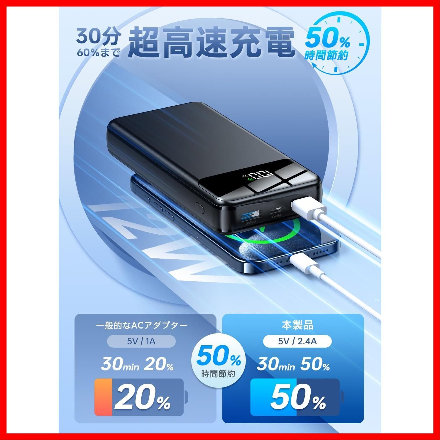 【2025大人気の新作・超大容量かつケーブル内蔵】Ciunedr製N10は本体にUSB Type-Cケーブルを内蔵し、特に外出先などでスマートフォンへの充電時の使い勝手を追求した最新のモバイルバッテリーです。幅152mm高さ74mm厚さ30mmと、スマホ程度の小ささ、ポーチや小さなバッグにも収まるコンパクトサイズ、ケーブルをわざわざ持ち運ぶ必要がないので、お出かけの際の持ち運びにも便利です。モバイルバッテリーは56800mAh大容量を備え、最大2.4Aでフルスピード充電が可能、終日を通して使用しても容量に余裕があります。 一般的なスマートフォンやタブレットであれば、複数回分のフル充電を確保できます。1日に1台ペースなら、本製品の充電も数日間は不要です。出張や旅行などの短期外出だけでなく、台風、地震など緊急災害時に非常用電源としても最適です。