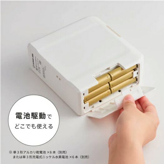 本体は、単3形アルカリ乾電池×6本(別売)または単3形充電式ニッケル水素電池×6本(別売)で駆動するため、