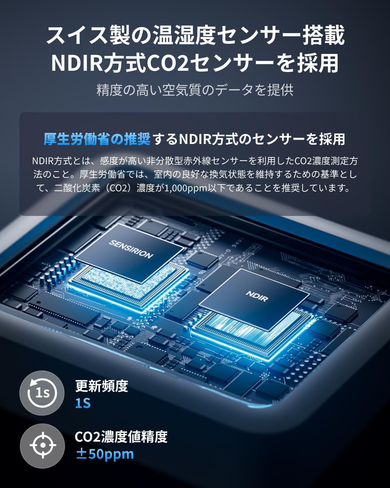 【NDIR方式CO2センサーとスイス製の温湿度センサー搭載】厚生労働省の推奨するNDIR方式のCO2センサーを採用し、高精度な空気質のデータを提供。厚生労働省では、室内の良好な換気状態を維持するためには、二酸化炭素濃度が1000ppm以下であることを推奨しています。さらに、信頼性の高い高精度な温湿度センサーを搭載し、常に最新の正確なデータを提供します。