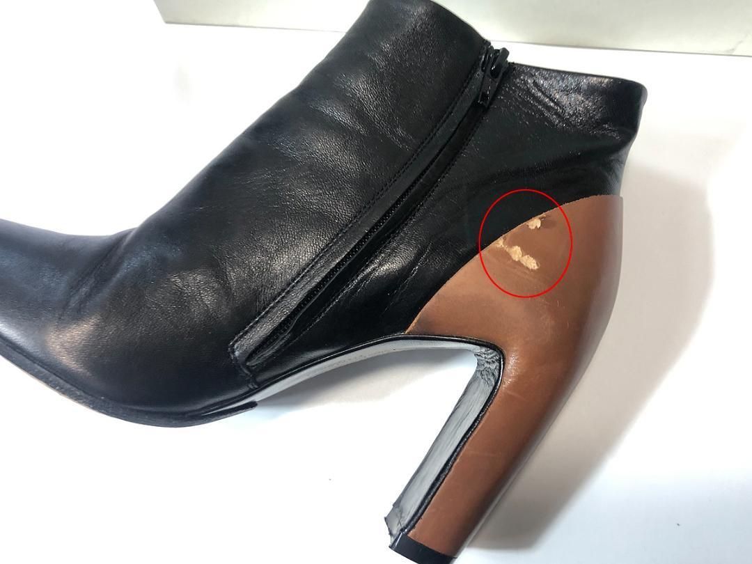 汚れやキズ、履きジワもほとんどありませんが、画像9/10枚目の通り、ヒール部分に少しレザーはがれがあります。