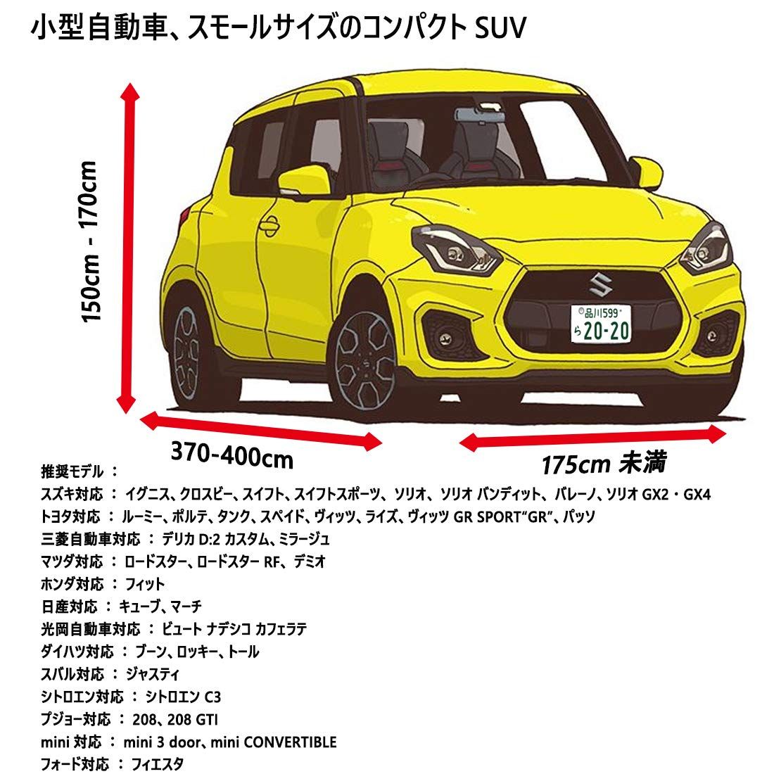 【サイズ】(約)長405cm×幅176cm×高152cm,汎用 サイズ(適合目安:車長 3.7m~4m/車幅 1.6m~1.76m),小型自動車、スモールサイズのコンパクトSUV 專用カバー 一般車。