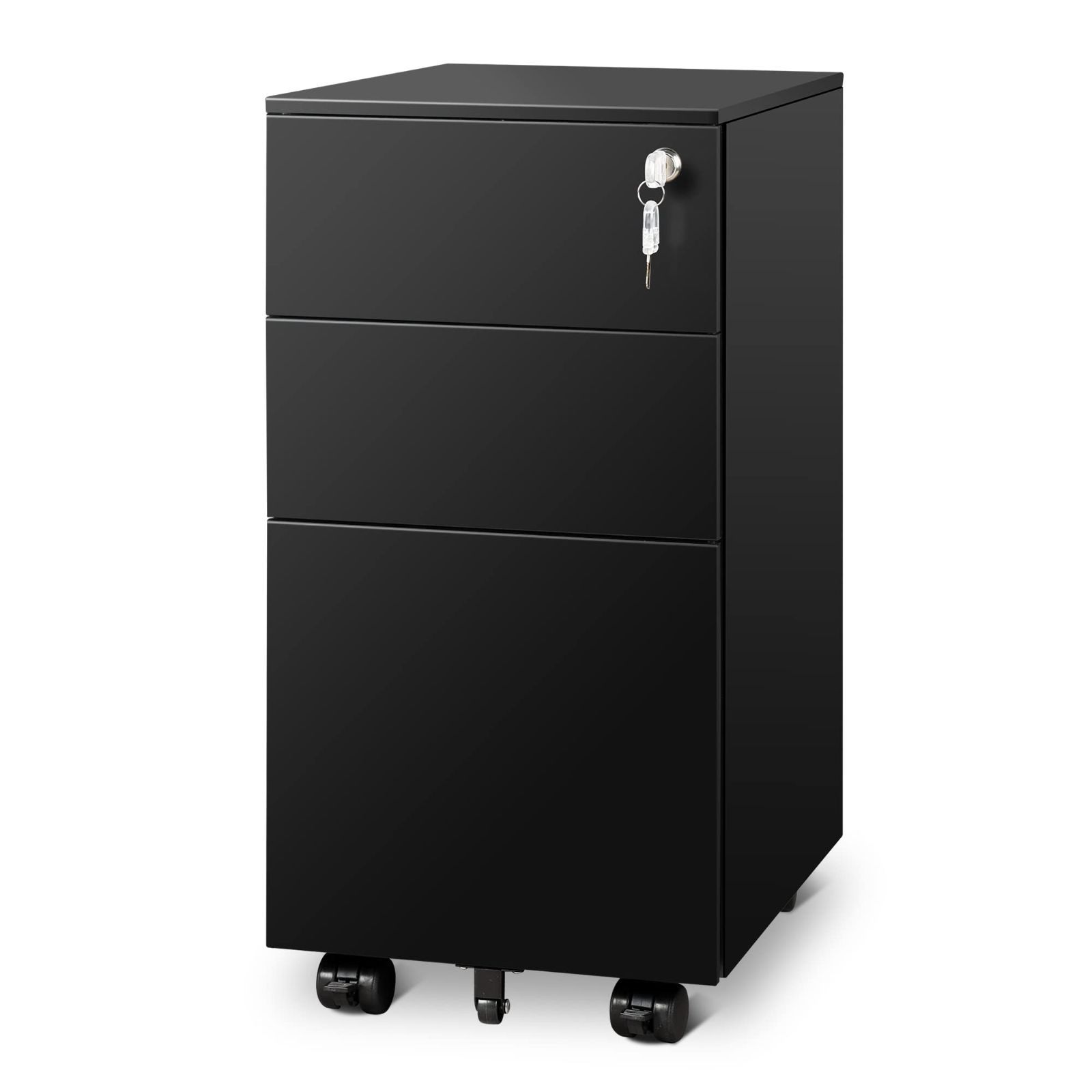 DEVAISE スリムワゴン デスクワゴン サイドワゴン オフィスワゴン キャビネット 幅300*奥行435*高さ600mm スリム型 コンパクトサイズ キャスター付き 鍵付き 3段オールロック A4対応 丈夫なスチール製 サビ止め塗装 ブラック
