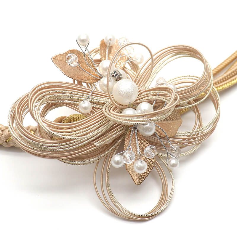 金ベージュの帯締めに、水引や小さめのパール飾りなどを用いて、煌びやかな雰囲気に仕上がっっております。振袖向きの華やかな帯締めです。上品な華やぎ感があり、品格のある華やかな着こなしをお楽しみいただけます。モチーフの大きさ:幅11cm