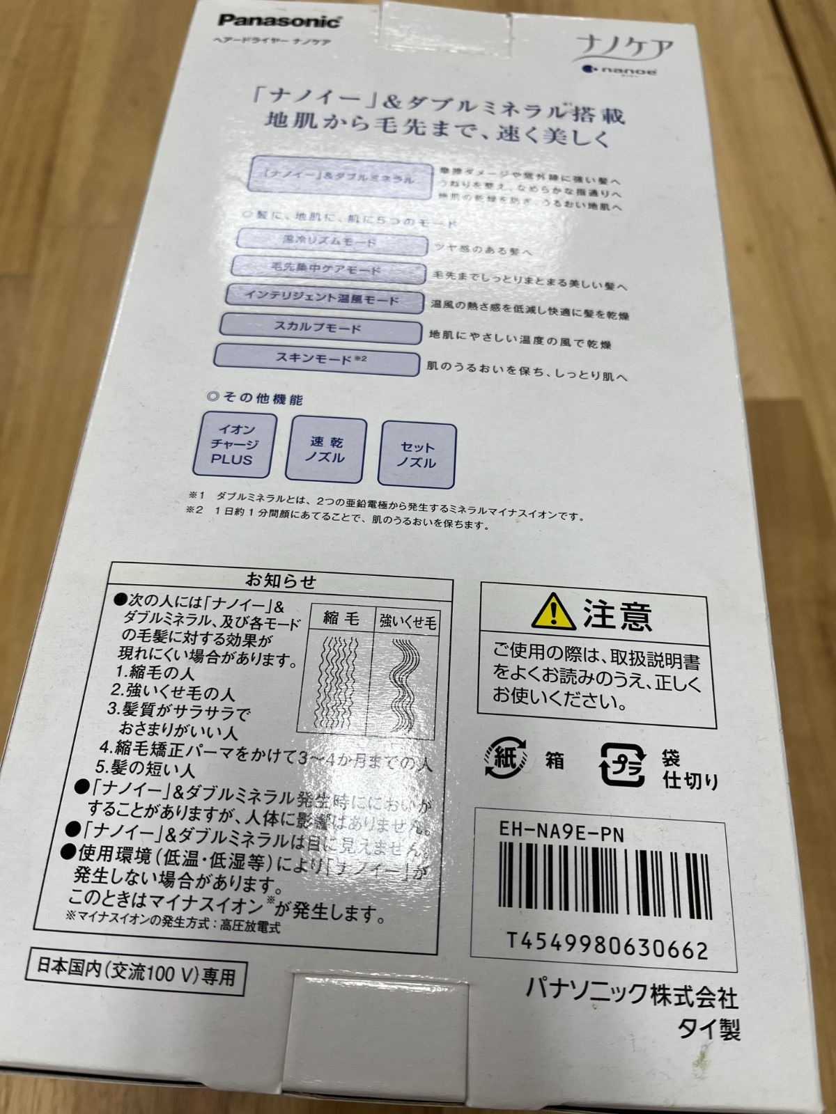 ご注意(免責)>必ずお読みください【パナソニック製品の修理に関するお問い合わせ】パナソニック修理ご相談窓口 TEL:0120-878-554受付時間:9:00~19:00 (日祝日及び年末年始9:00~17:30)インターネットより「パナソニック修理」で検索商品紹介「ナノイー」&ミネラル搭載。地肌から毛先まで、速く美しく。・「ナノイー」&ミネラル※1で、キューティクルを密着、 しっかりまとまる髪へ。「ナノイー」&ミネラル※1がキューティクルを引き締め、密着させ、指通りのよいまとまりのある髪に仕上げます。・UVケア効果で、紫外線や摩擦ダメージに強い髪へ。「ナノイー」&ミネラル※1が髪に浸透。キューティクルの密着性を高め より紫外線に強く、ブラッシングなど摩擦からのダメージをおさえます。・バランスのよい風で、美しく速乾。「風の強弱差」「風圧」「風温」「風量」にまでこだわったバランスのよい風で、髪を「速く」「美しく」乾かすサポート。※1ミネラルとは亜鉛電極から発生されるミネラルマイナスイオンです。