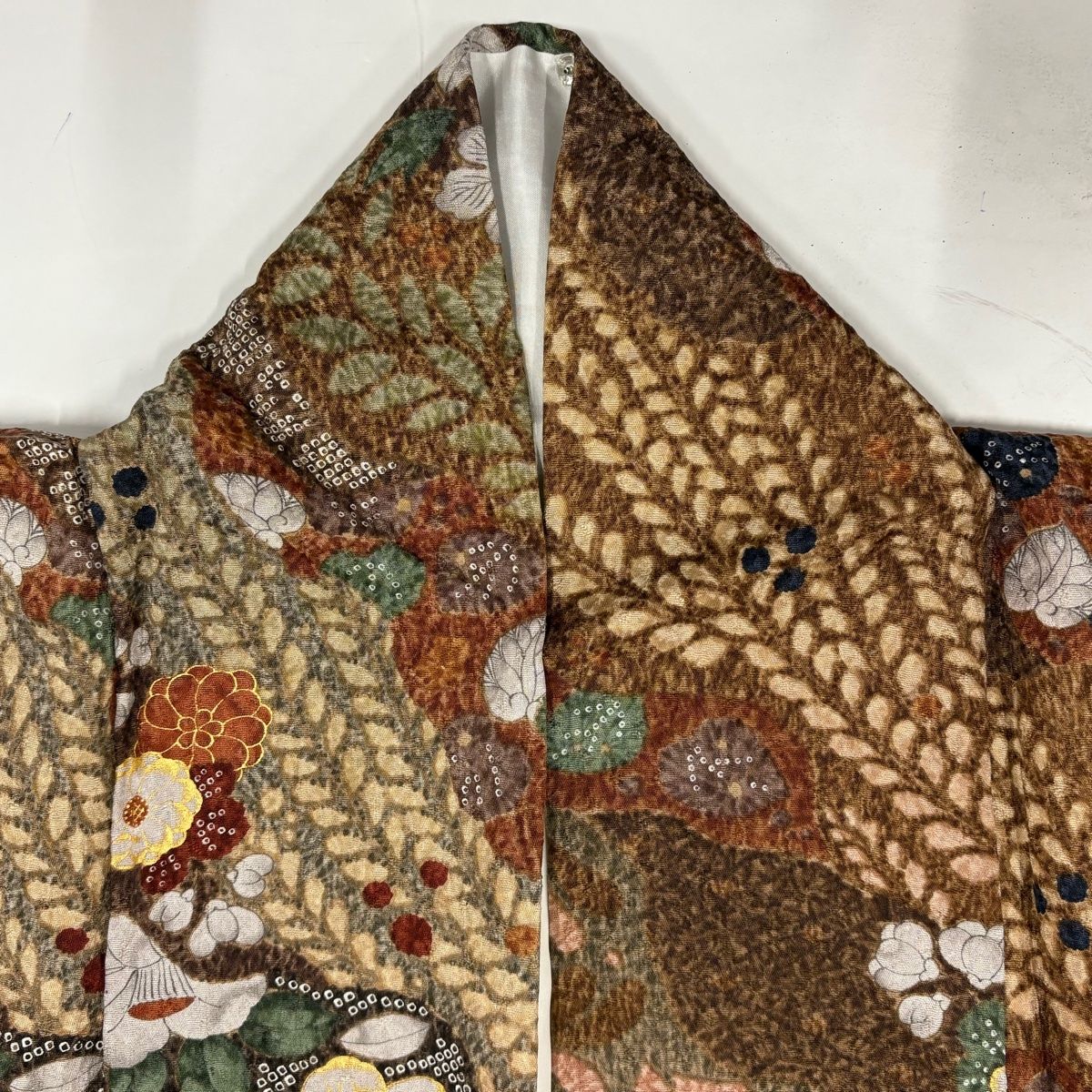 小紋 身丈159.5 cm 裄丈66 M 袷 椿 草花 金彩 茶色 正絹 秀品