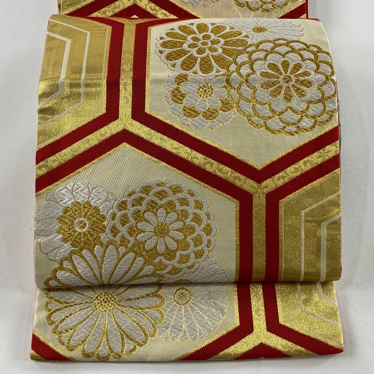 袋帯 秀品 亀甲 菊 金糸 箔 赤 六通 正絹