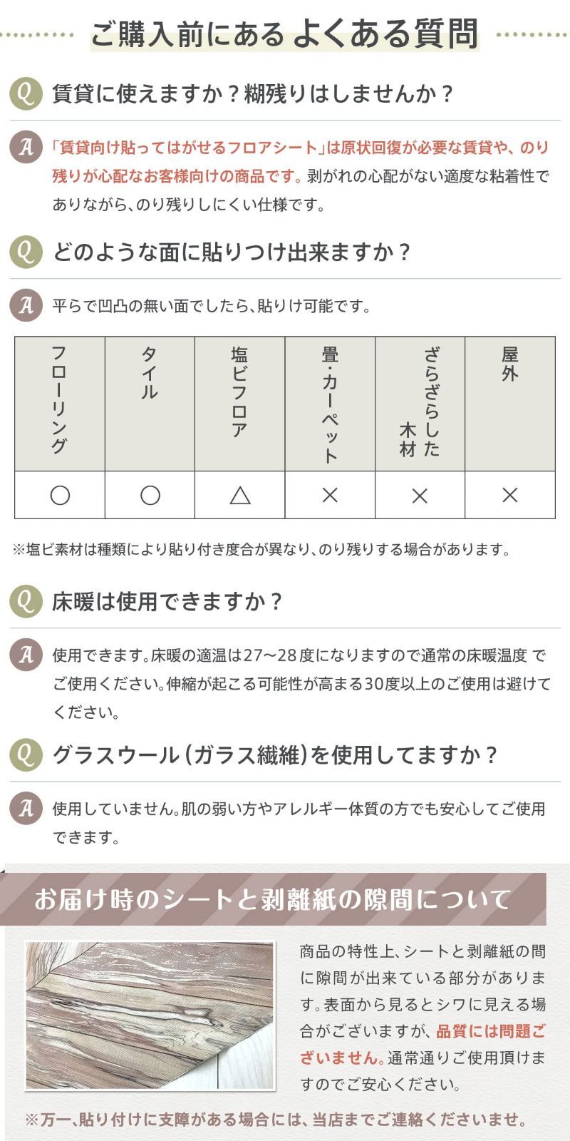 【貼れる場所】フローリング(賃貸もOK)、塩ビフロア、タイル、床暖房可(約60℃目安)【 厚さ】約0.45mm【リピート目安】約80cm