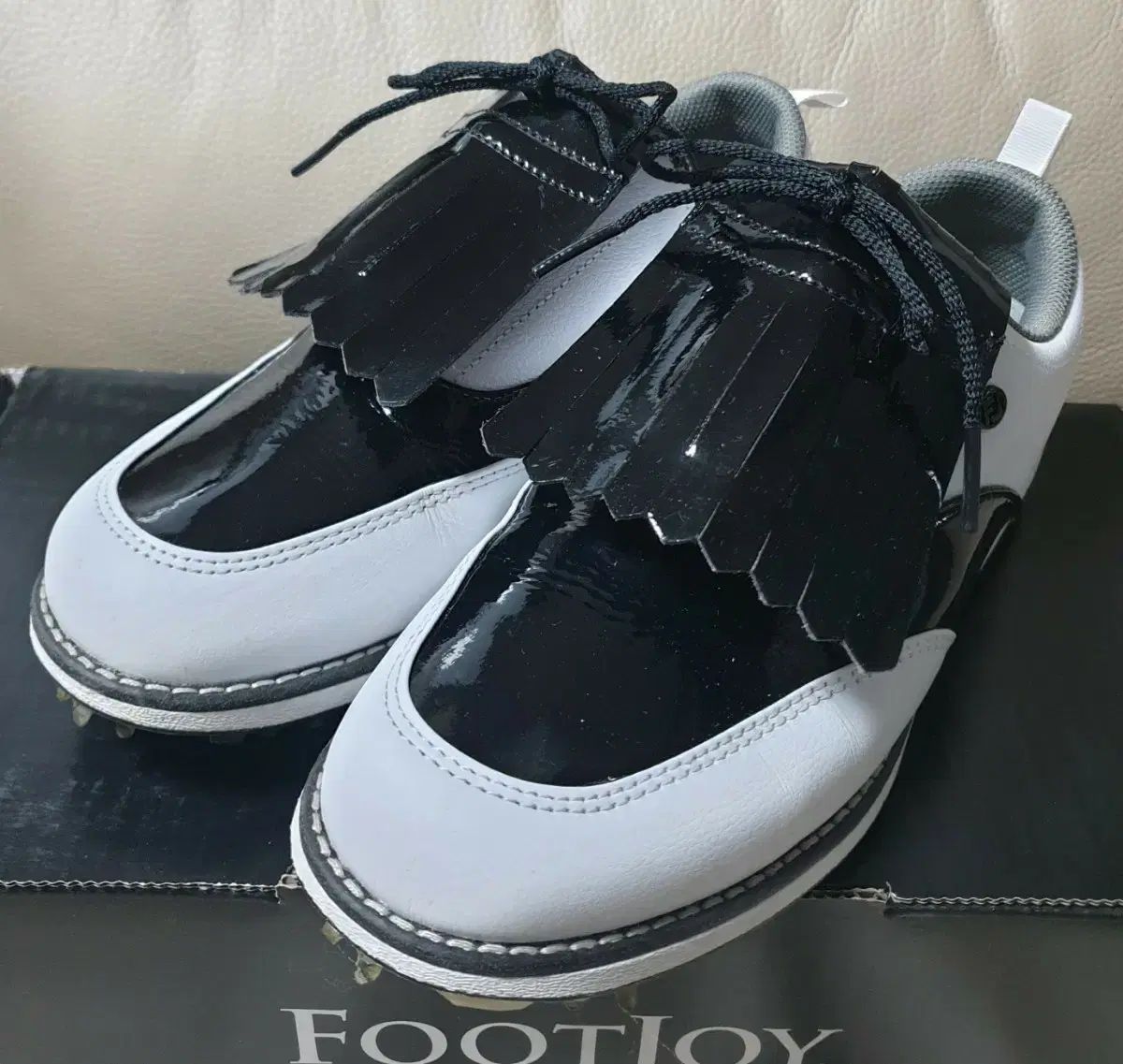 フットジョイ プレミア クラシック 厚底 ゴルフシューズです。白と黒の調和がとても 멋스럽습니다。厚底 インソール が 付き なので、ラウンドの フィット を 살려줍니다。コメント 無し でしたら すぐに 安全決済 してください!