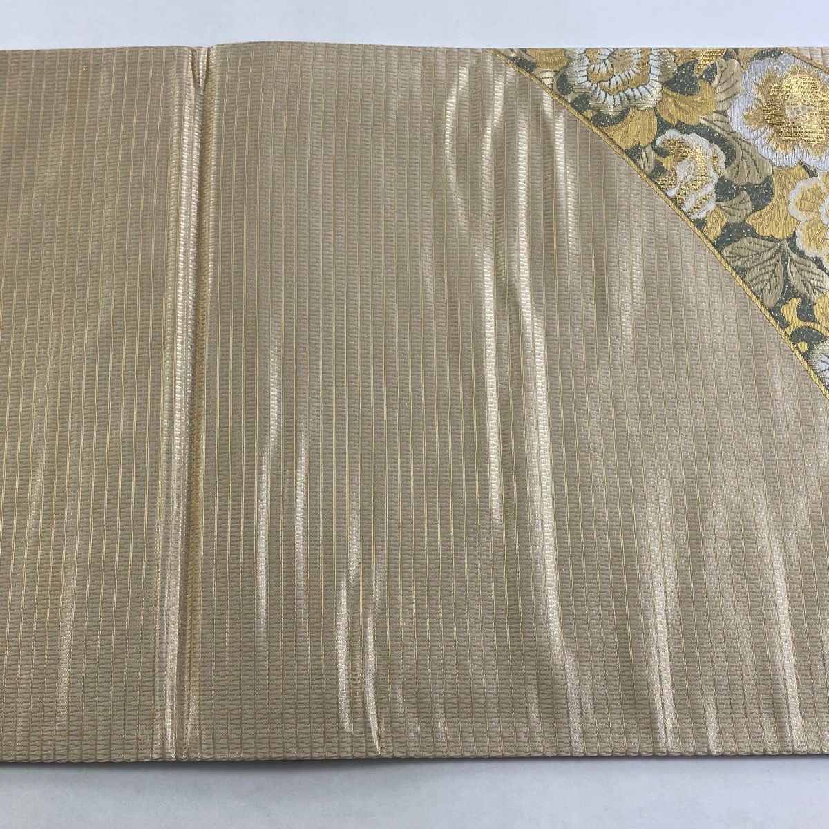 袋帯 秀品 草花 縞 金銀糸 箔 金色 お太鼓柄 正絹