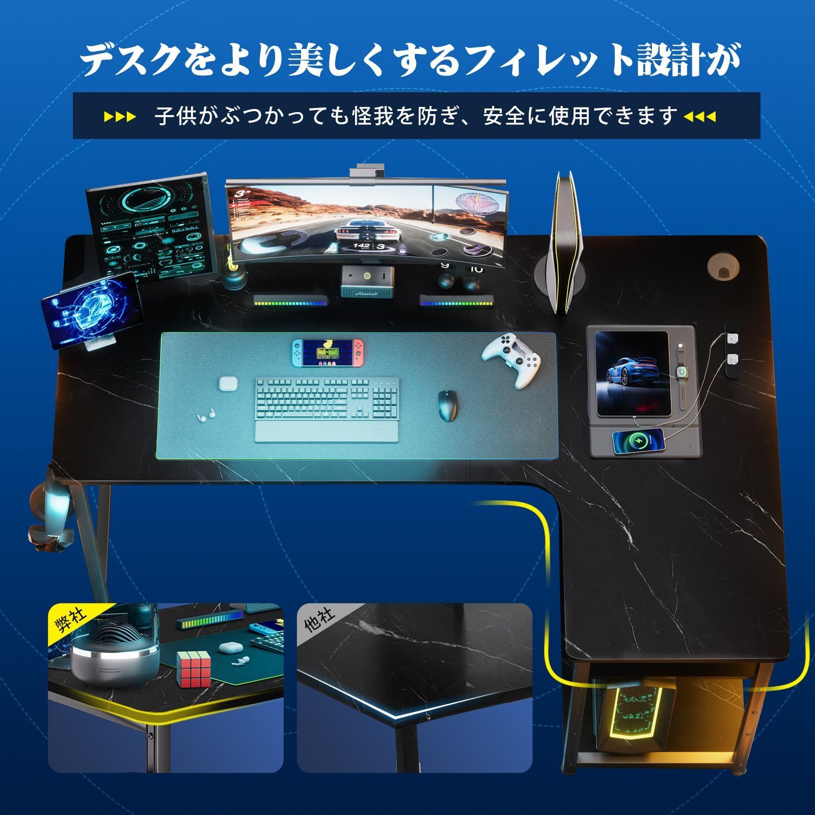 【小型モニター台と配線穴&コンセント付くpcデスク】小型モニタースタンドには、パソコンやiPadなどの小物を置くことができ、2つのコンセントが付いており充電が便利です。さらに、配線穴があり、配線もスッキリとまとめられます。【安心感と安全性を提供するフィレット設計】先端が尖っている市場に左右の入れ替え可能な棚付きl字デスクより、フィレット設計の棚は子供に安全で、右棚のみでございます。