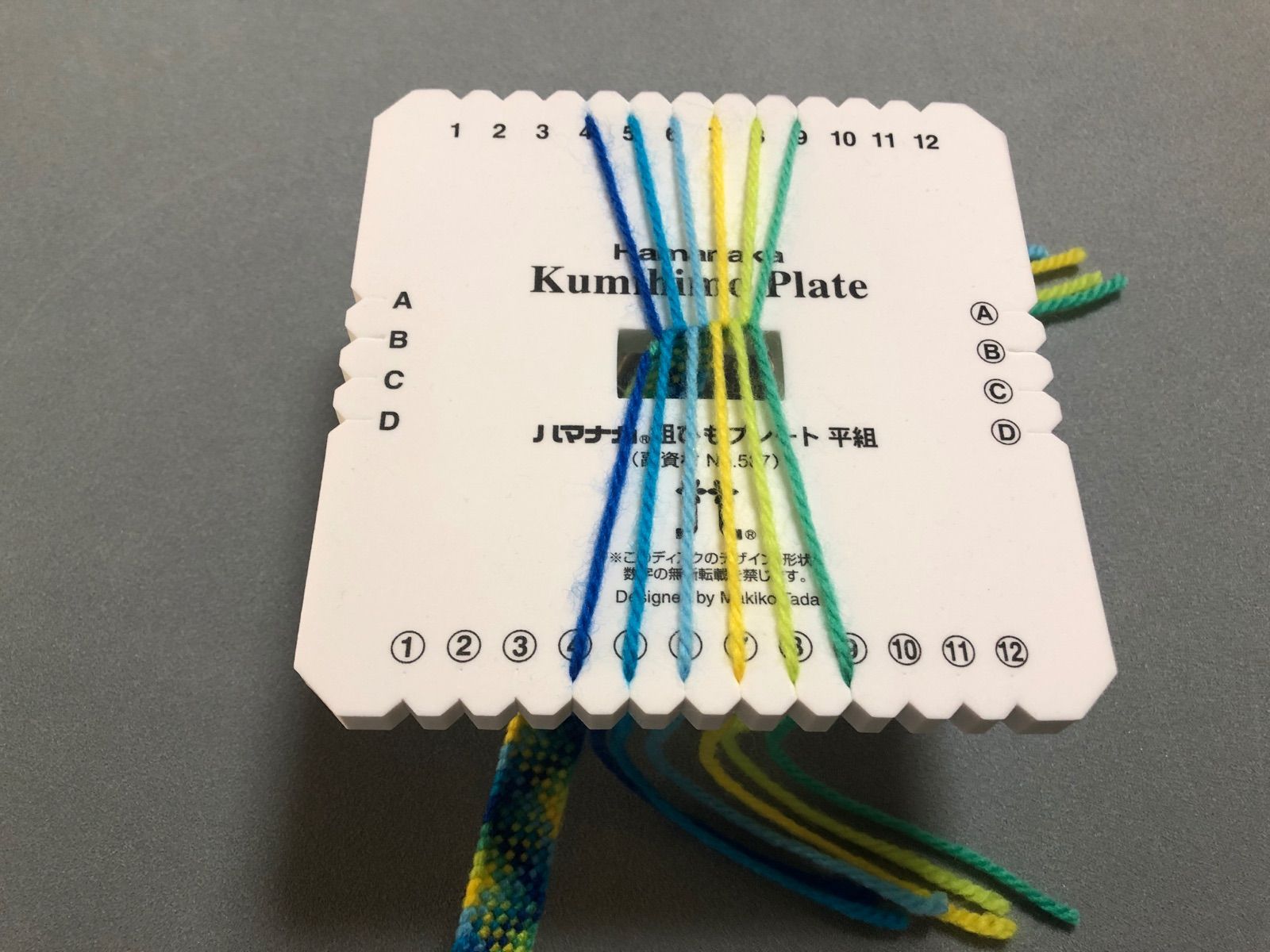ディスクは直径150mm、厚さ9mm、軽量で弾力のある発泡ポリエチレンで、その周囲のスリットに糸を固定し、一定の規則で糸を入れ替えてゆくと、ディスク中央の孔の中に紐が伸びる様にできていきます。このスリットに挟むことがおもりの替わりをします。輸入品ではこのスリットの保持力が長続きしないものが多いのでご注意下さい。