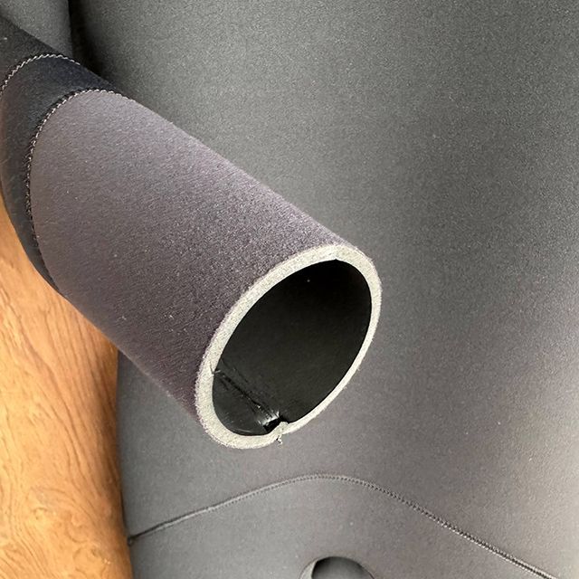 折り込んだハイネック部分が首と密着し、首を傾けても隙間があきにくい構造で、水の浸入を最小限に抑えます。