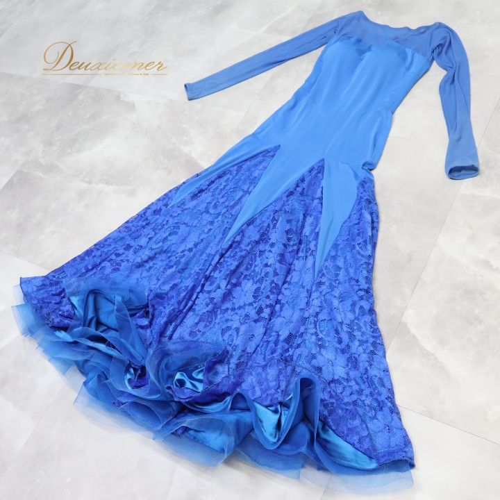 社交ダンス 衣装 ドレス ワンピース 青 レース パーティ 発表会 感 上品 伸縮 ブルー系 おしゃれ フェスティバル ダンス衣装 フォーマル シンプル 美しい