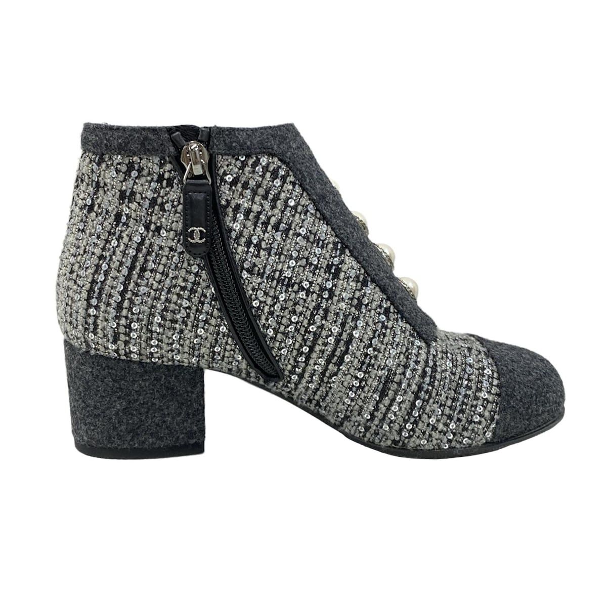 CHANEL シャネル ブーティ 34 1 2 C レディース G 33181 グレー×白 フェイクパール スパンコール アウトソール張替済 ウール