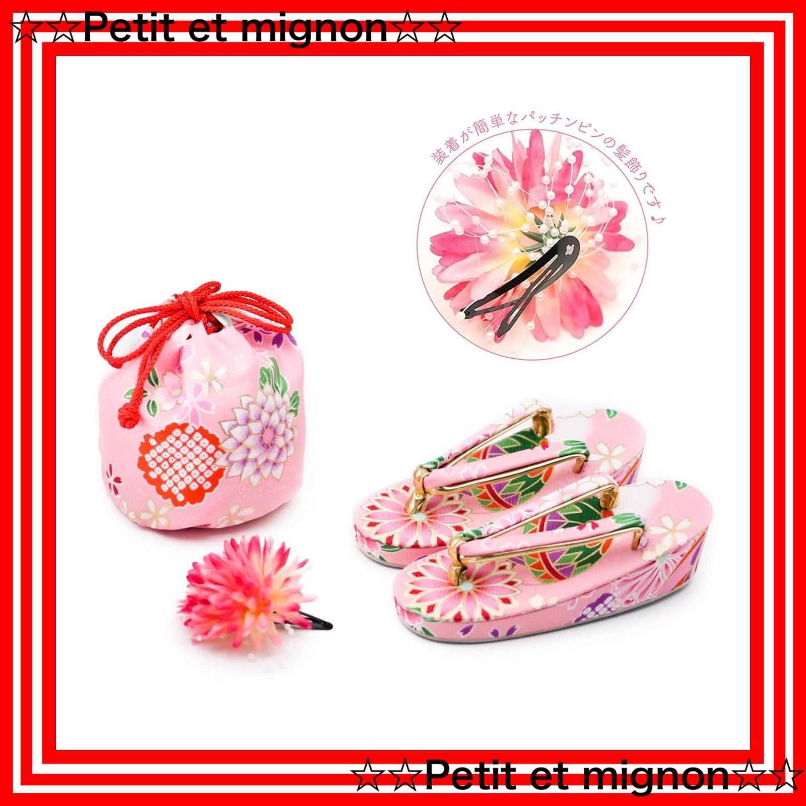 髪飾りや巾着、草履など含めて9点のフルセットなので、これだけで必要なものがすべて揃います。はじめての方でも簡単にできる着付けの説明書をお付けいたします。