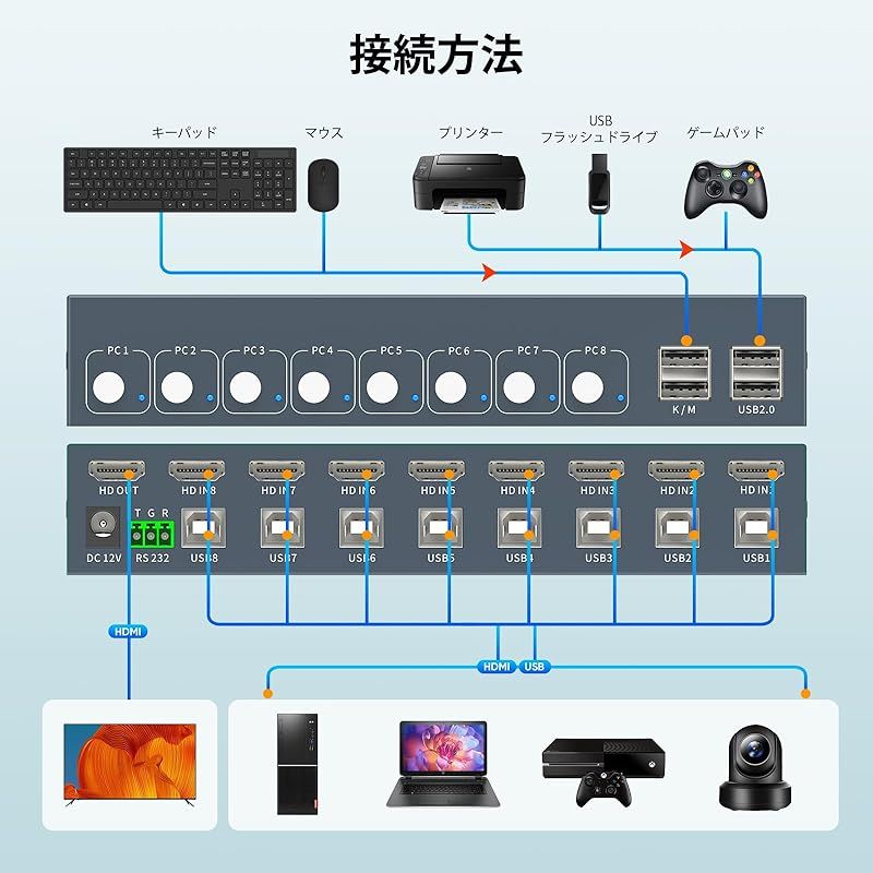 商品名:USB2.0 KVMスイッチ HDMI 8入力1出力, 8台のPCコンピュータが1台のモニタを共有,2つUSB2.0ハブ備えた KVM HDMI 8 IN 1 OUT, 4K@30Hz対応 KVM 8入力PC切替器,ボタン切り替えとホットキー機能対応,RS23