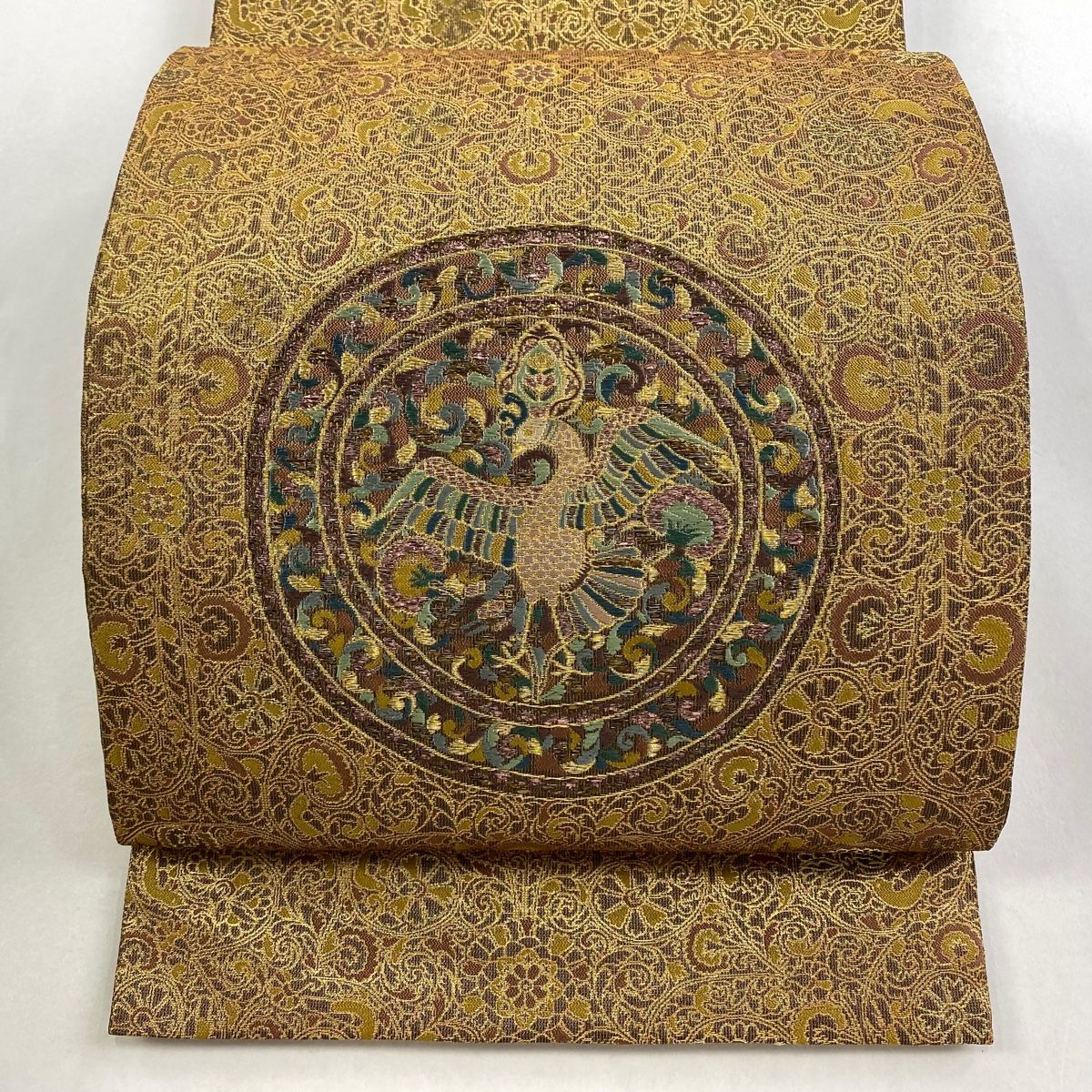 袋帯 秀品 鳥 花唐草 金糸 箔 山吹茶色 お太鼓柄 正絹