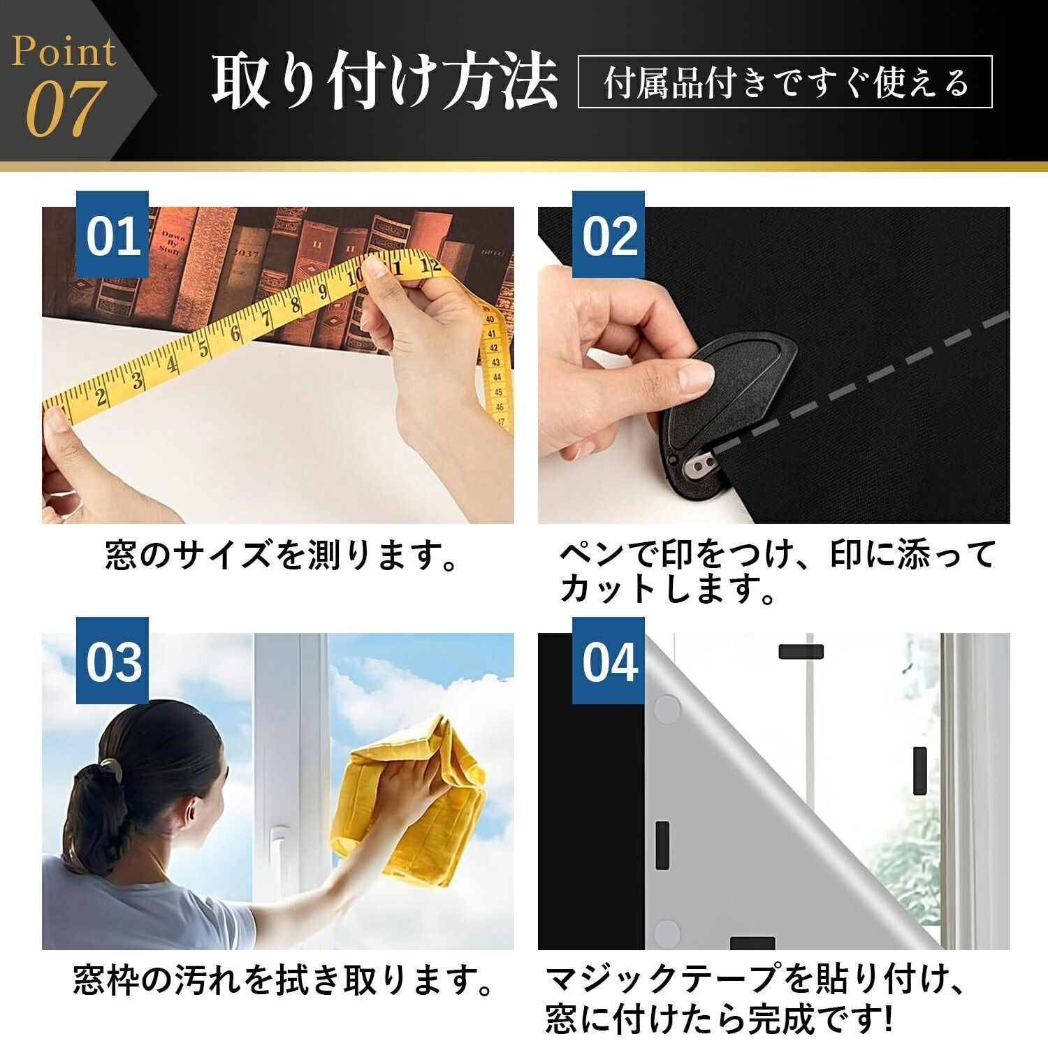 簡単取り付け&カット可能 マジックテープ+粘着シールで取付簡単!自由にカットでき、窓にぴったりフィット。