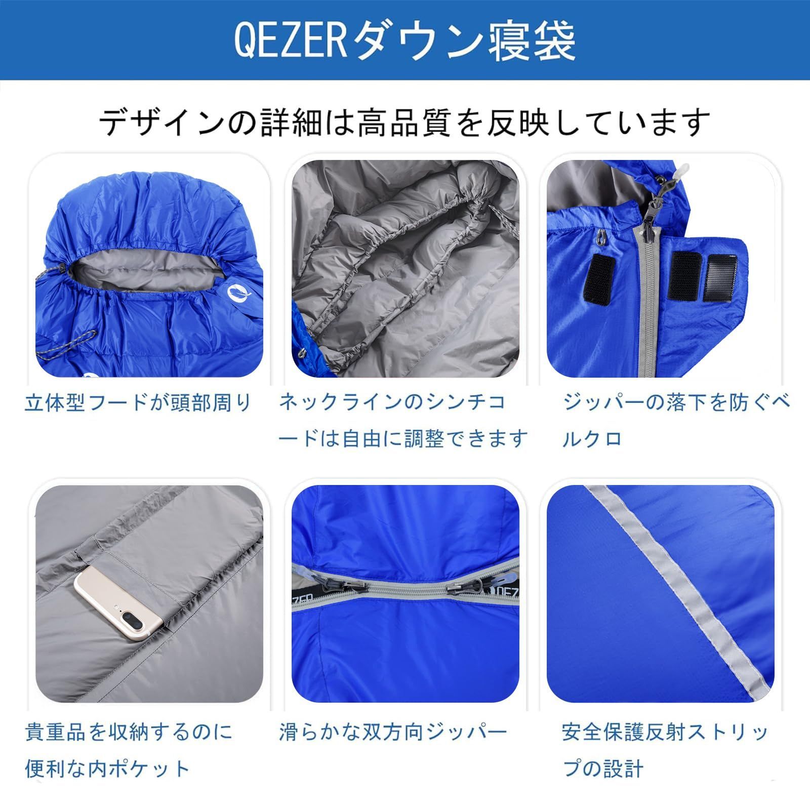 QEZER 寝袋 冬用 ダウン 封筒型シュラフ 軽量高級ダウン シュラフ 500g~1200g充填 400T撥水加工 羽毛寝袋 コンパクト 足が出せる 全開可能 キャンプ 登山 車中泊 防災用